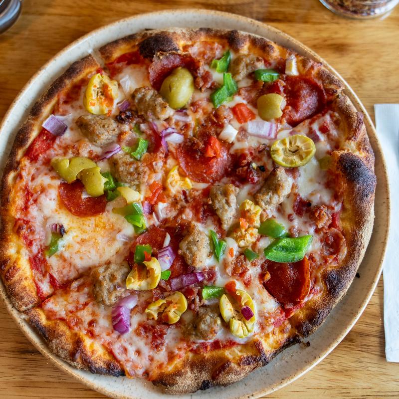 16" $23.95 | 12" $18.25 | 10" $12.95 • Tomato base, mozzarella, pepperoni, bacon, sausage, bell peppers, onions, green olives.