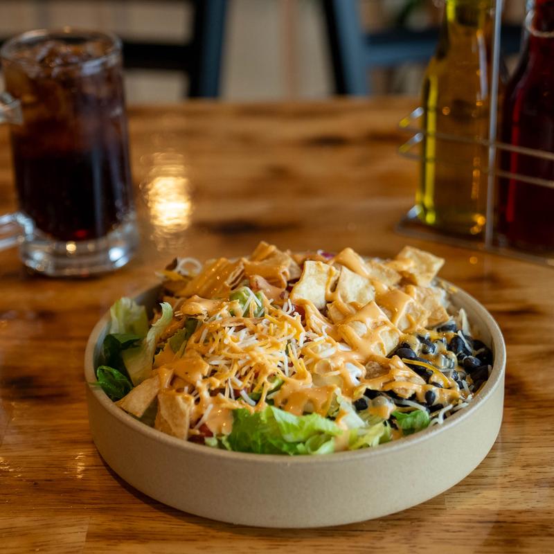 Mixed greens, avocado, feta cheese, onions, carrots, tomatoes, chips.